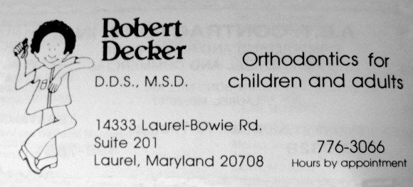 This caricature from a 1985 Laurel Community Guide advertisement is exactly how thousands of 30-something, 40-something, and probably even 50-something adults with nice smiles remember Dr. Robert Decker—who was the premier orthodontist in Laurel for an entire generation.