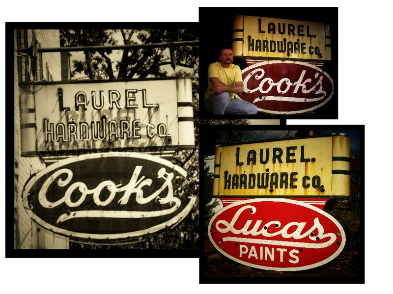 “HIDDEN MESSAGE! I discovered the lower portions, or ‘Cook’s’ panels were lay-overs, concealing the original message. Lucas Paints were manufactured in Pennsylvania for about 75 years when bought out by Sherwin-Williams, in the early 1950’s. The owner of Laurel Hardware had his name added to the sign to cover over the Lucas paints portion, which only was exposed for about the first ten years of the life of the sign. I also discovered the faded nameplate of the original manufacturer of the sign…Triangle in Baltimore. The ‘John Tingen’ lettering was probably from the time the ‘Cooks’ layovers were created.”