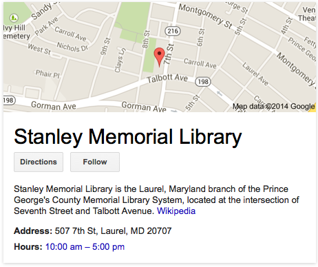 But at the same time, most of us who use these abbreviated names are still conscious of the fact that the building does have a proper name gracing its exterior—the Stanley Memorial Library. And now, for whatever reason, the Prince George’s County Board of Library Trustees is planning to formally drop Stanley’s name from the new building entirely. And they’re doing so under the auspices of “helping the public find the library”—as if A) people in Laurel have forgotten that there’s been a library at this location for nearly half a century, and B) you couldn’t Google directions in a matter of seconds—in this Internet age that has, in effect, almost made libraries obsolete.