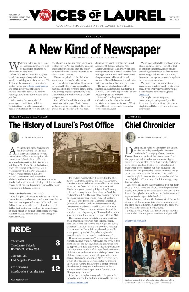 Voices of Laurel is a new kind of newspaper—a free, quarterly digital edition produced by a diverse range of contributors. It’s not a newspaper in the truest sense of the word, but rather a collection of articles about Laurel written by people from Laurel—history pieces, stories from first responders, hometown memories, profiles, and a whole lot more.