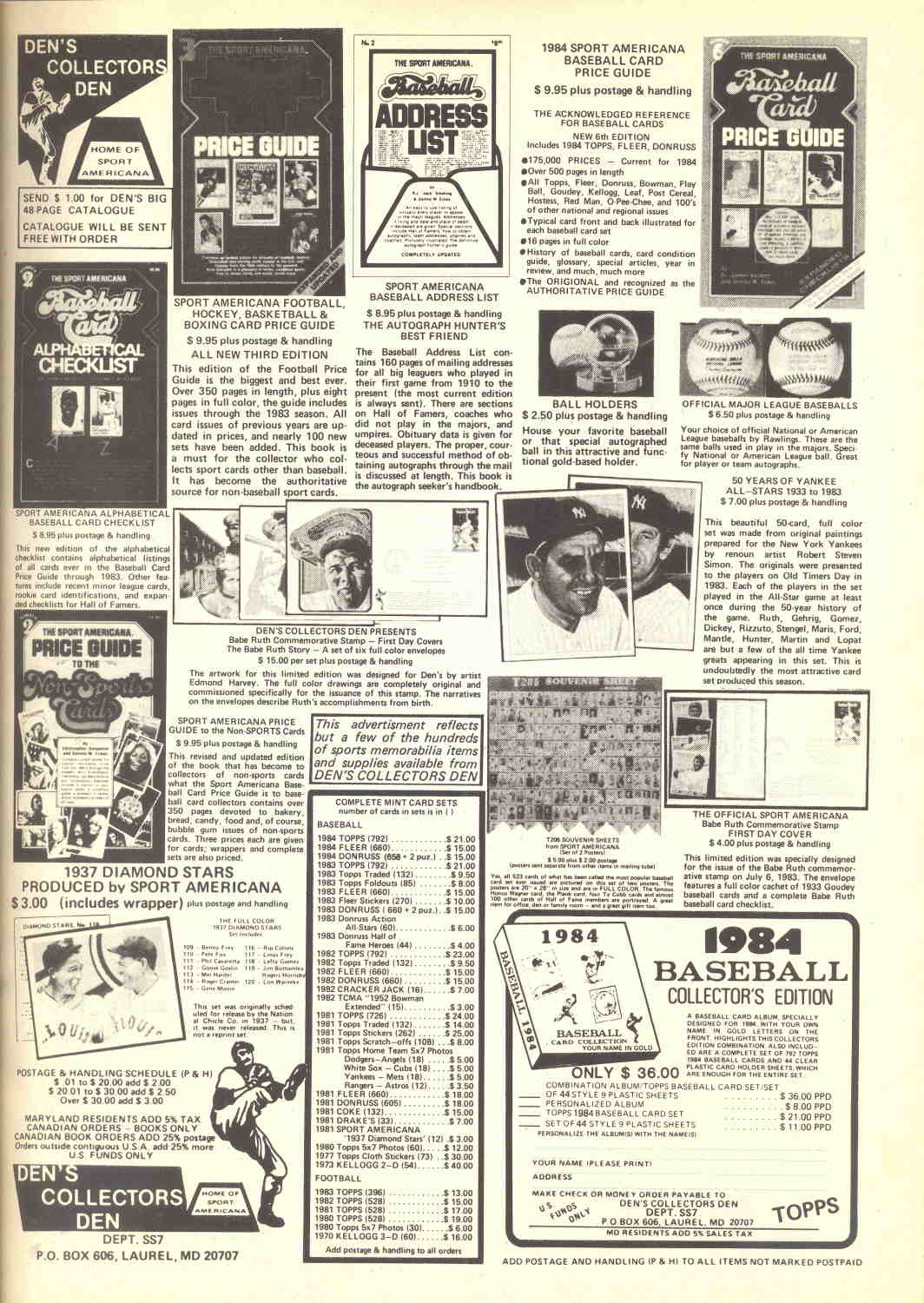 The edition with the white cover was the original, and is the Holy Grail of price guides if there ever was one. But shortly thereafter, an alternate cover was designed that included the “Baseball Card” logo in a custom typeface—this would appear on all subsequent issues under the Sport Americana banner. And on the back cover of both was a full-page, full-color ad for Den’s Collectors Den.