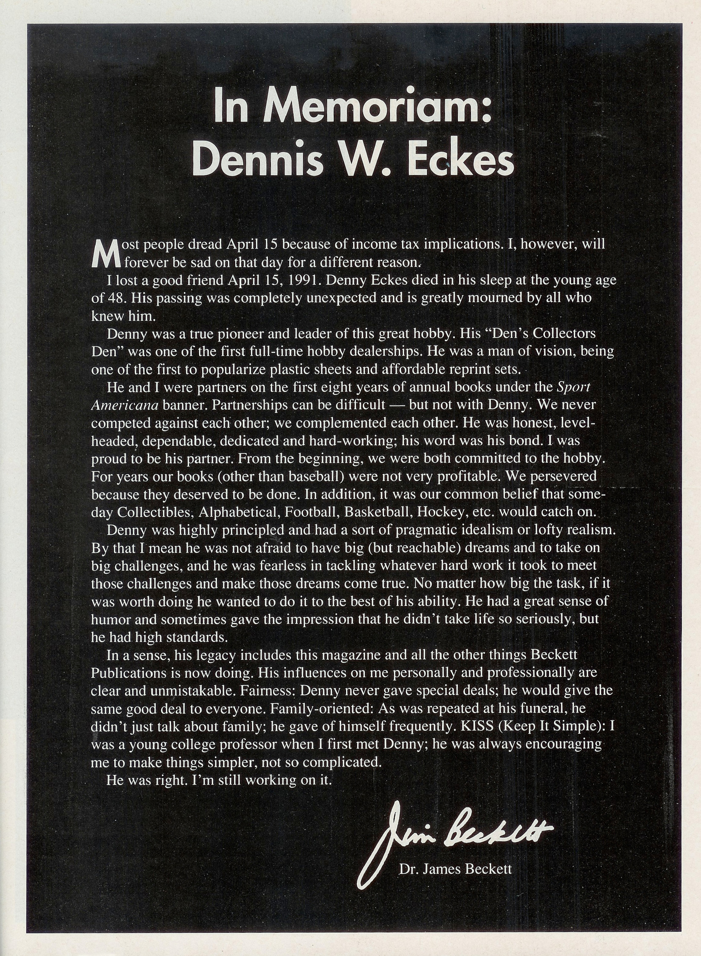 Unfortunately, I found the answer in the June 1991 issue of Beckett Baseball Card Monthly, one of the many expanded publishing efforts that James Beckett had taken on after his early success with Denny and Sport Americana. Filling the first page of that issue is a moving tribute—a eulogy to Dennis W. Eckes, who’d passed away unexpectedly in his sleep on April 15, 1991. He was only 48. The eulogy was written by Dr. Beckett himself, and paints a glowing portrait of a true visionary whose influence is still being felt in what has become a bigger business than ever before.