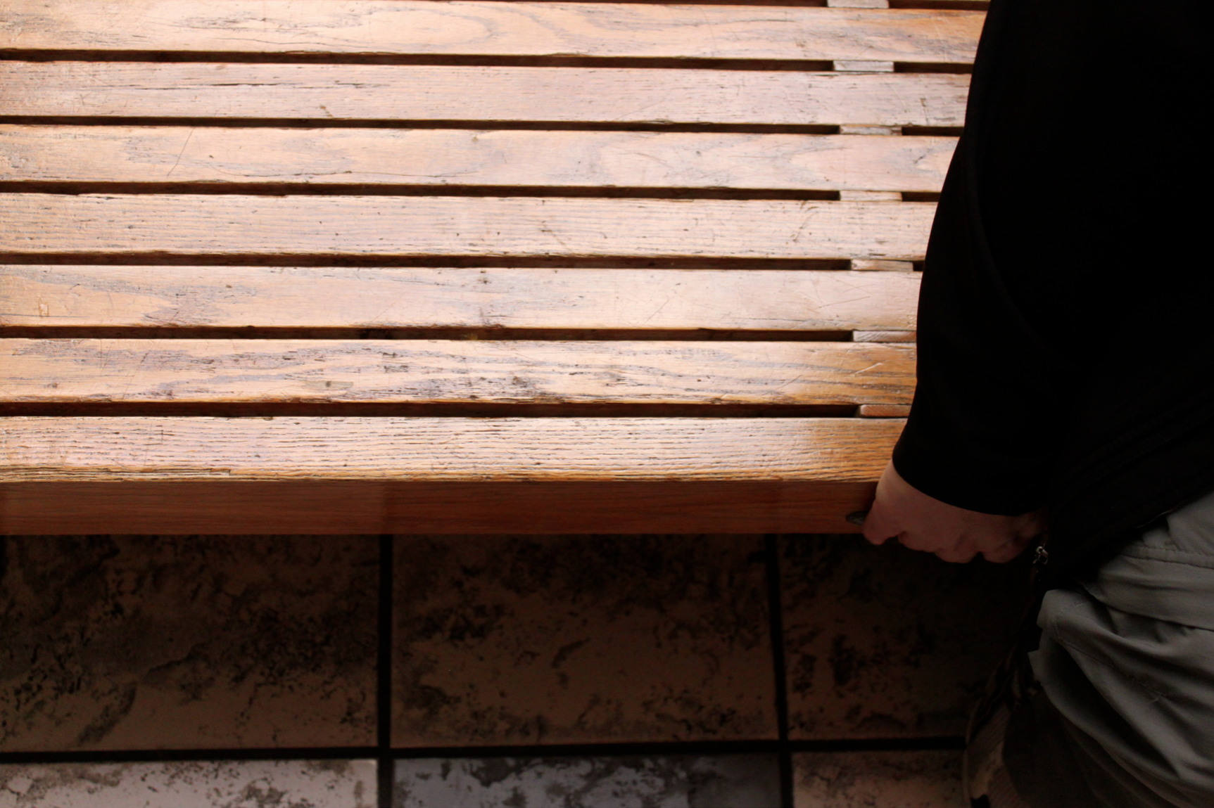There were a couple of “structural details” that I felt compelled to photograph, one way or another. These were remnants of the original Laurel Centre Mall that I once knew—remnants that existed before the mall’s inexplicable makeover in 1991 (when the mall was only 12 years old) that saw the complete removal of the beautiful, polished brown tile floors, wooden handrails, and wooden storefront frames in favor of white formica flooring and blue-painted metal rails. Hiding beside the old J.C. Penney was one of the original benches, and just outside the closed gate of the former Spencer’s Gifts was a row of the original brown floor tiles.