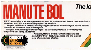 I’ve been a vegetarian since roughly 2004, but if you were to offer me a Church’s Fried Chicken two-piece spicy box with biscuit, I would happily eat it. In fact, if Church’s were still at Town Center, I’d drive there for it right now myself—especially if you told me it was this 1986 Manute Bol and Spud Webb promo box.