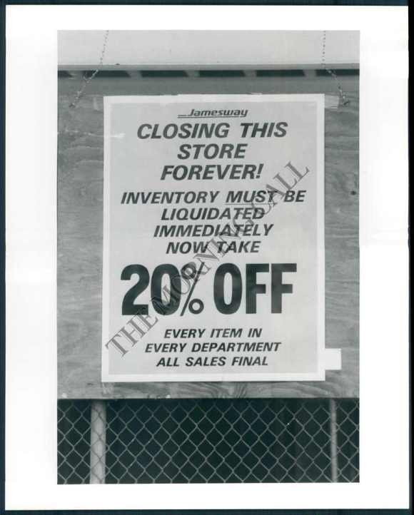 Jamesway definitely fared better than Woolco did, and the Laurel store proved to be a popular and successful location that remained through the decade. But the 1990s weren’t nearly as kind, and by 1991—despite the 138 stores and sales of $855 million, according to Wikipedia—changes were afoot. A refinancing saw 11 stores close that year; and by July 1993, Jamesway had filed for Chapter 11 protection. Additional stores continued to close throughout 1994, as the company spiraled downhill. Finally, between October and December 1995, Jamesway closed all of its remaining stores and liquidated its inventory… even down to all those unused price stickers.