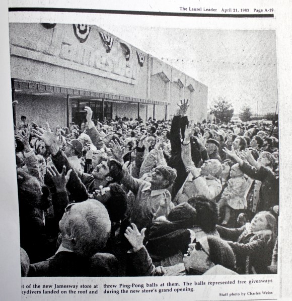 So, the Woolco experiment didn’t go quite as planned in the old Hecht Co. building. And just a little over a year later, in April 1983, another store tried its luck. So did hundreds of eager Laurel residents, who came out on opening day to try to catch ping-pong balls—being tossed from the roof by skydivers—in order to win free door prizes.