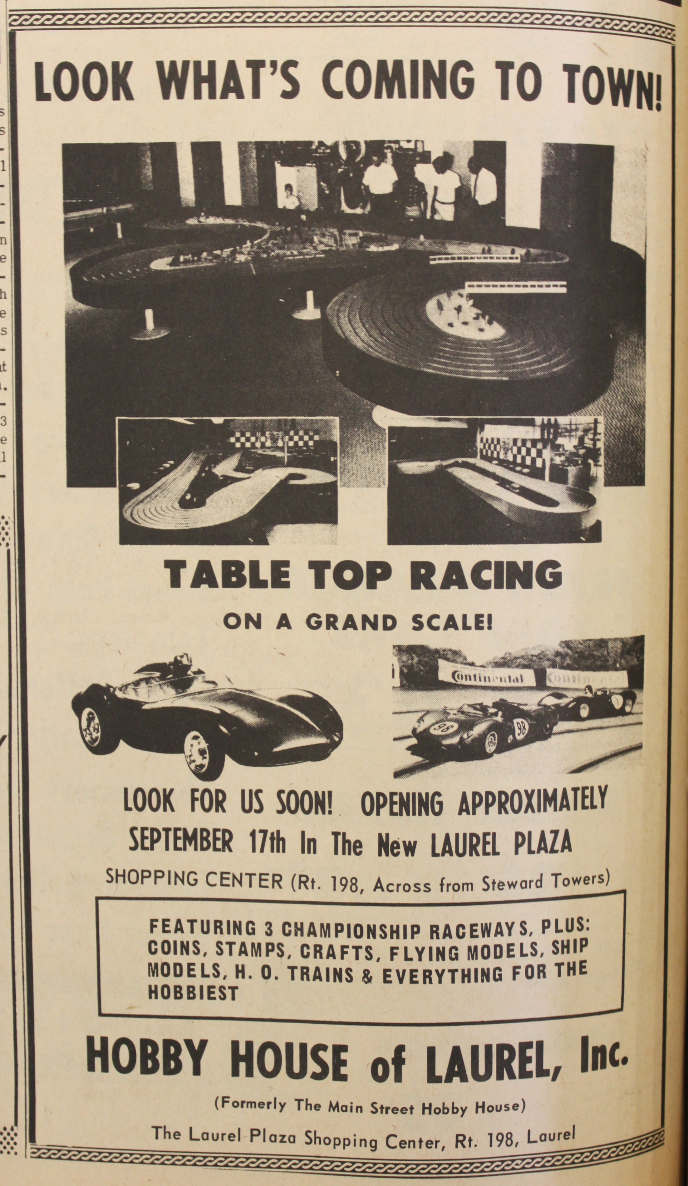 While Hobby House was part of the new Laurel Plaza Shopping Center, it wasn’t actually a brand new store. It had previously been located at 342 Main Street—current location of the Laurel Board of Trade—for five years. The Main Street location, however, didn’t have the slot car racing tracks; and its new store was the first of its kind in the Laurel area. In fact, owner Bill Bromley proclaimed his three new championship-approved tabletop tracks “the finest facilities available in the state”.