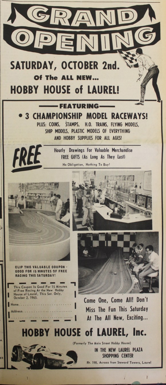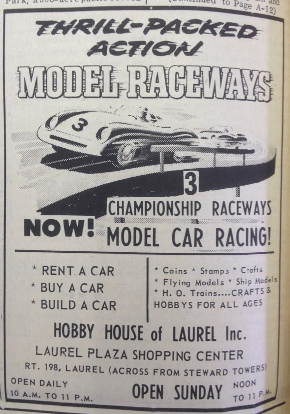 Throughout the summer of ’65, Hobby House advertised heavily in the Laurel News Leader—bold, exciting ads that showcased the store’s massive tabletop slot car racing tracks. As if that wasn’t enough to draw you in, they also carried a full line of all things hobby: coins, stamps, model airplanes, model ships, model trains, and more. It was essentially Laurel’s precursor to HobbyWorks—which, coincidentally, remains open in Laurel Shopping Center to this day.