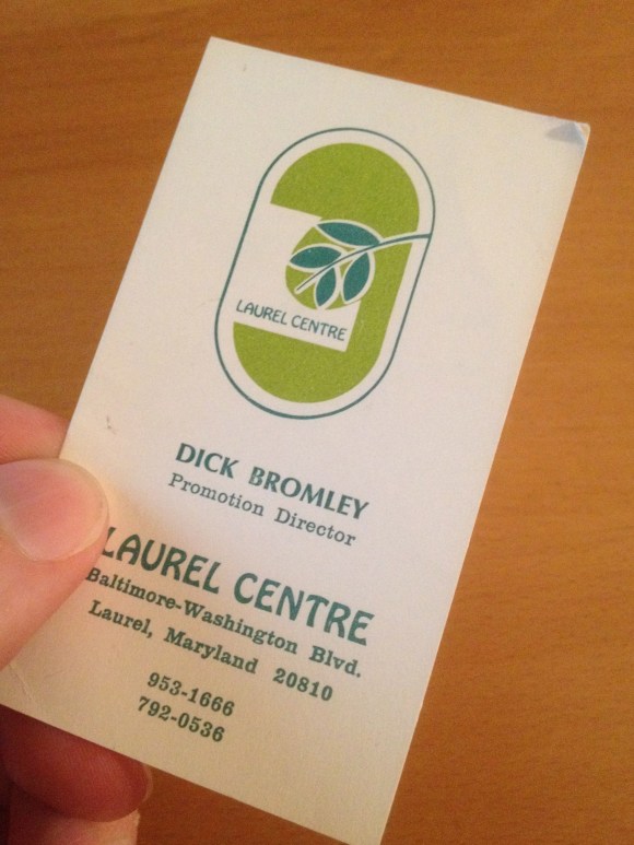 John did indeed have a business card for me, from Dick Bromley’s term as Promotion Director at Laurel Centre—complete with its original logo before the ill-advised April 1998 “Laurel Mall” rebrand!