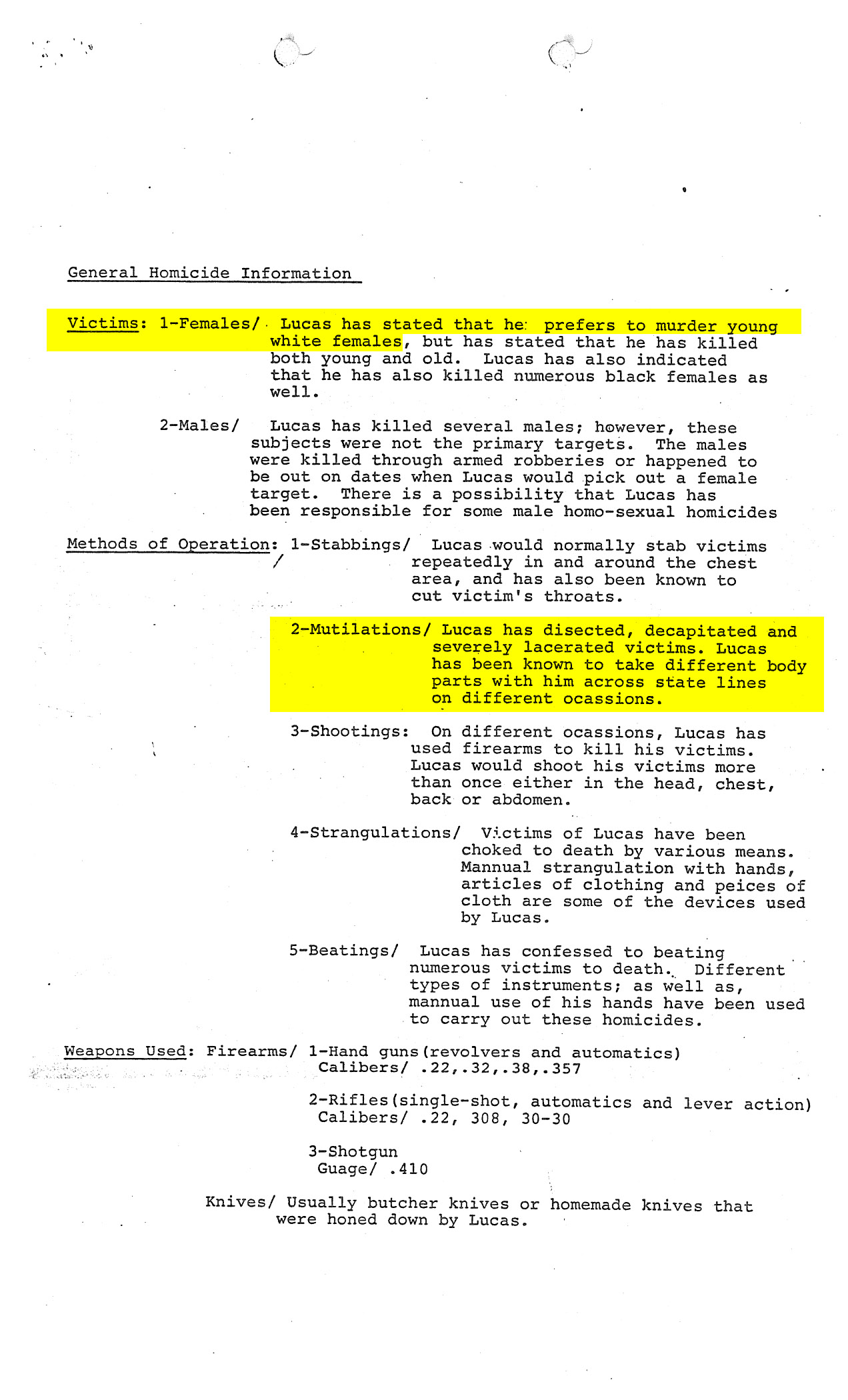Beginning in 1978, Lucas and Toole embarked on a series of cross-country murder sprees. Lucas would later claim that during this period he had killed hundreds of people, with Toole assisting him in “108 murders,” by his estimation. Lucas stated that his preferred victims were young white females; Toole preferred men. Their methods of operation included everything from stabbing, shooting, strangulation, and beating to mutilations—with Lucas having been known to decapitate victims and carry body parts with him across state lines on different occasions.