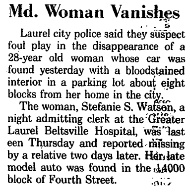 Initial reports stated only that it was a citizen who made the grisly discovery, and on Tuesday, September 7th, the Maryland Medical Examiner’s office confirmed that the remains were indeed those of Stefanie Watson. Positive identification was made with dental records, according to then Laurel Police Lt. Archie Cook, who had headed the investigation to that point. He tactfully declined to elaborate on the physical condition of the remains, only to say that various television reports—likely about the partial skeletal remains being only the head—were unconfirmed.