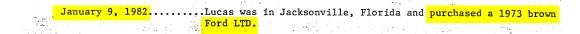 Take a closer look at that first page—the timeline of travel movements. Did you notice anything else particularly interesting in regard to Stefanie Watson? Remember the vehicle the witness reported having seen on Larchdale Road that night? It was described as “a 1975 to 1978 Ford LTD, medium to dark green body with a green vinyl roof.” According to multiple entries in Vic Feazell’s notes, Lucas purchased a 1973 Ford LTD on January 9, 1982: