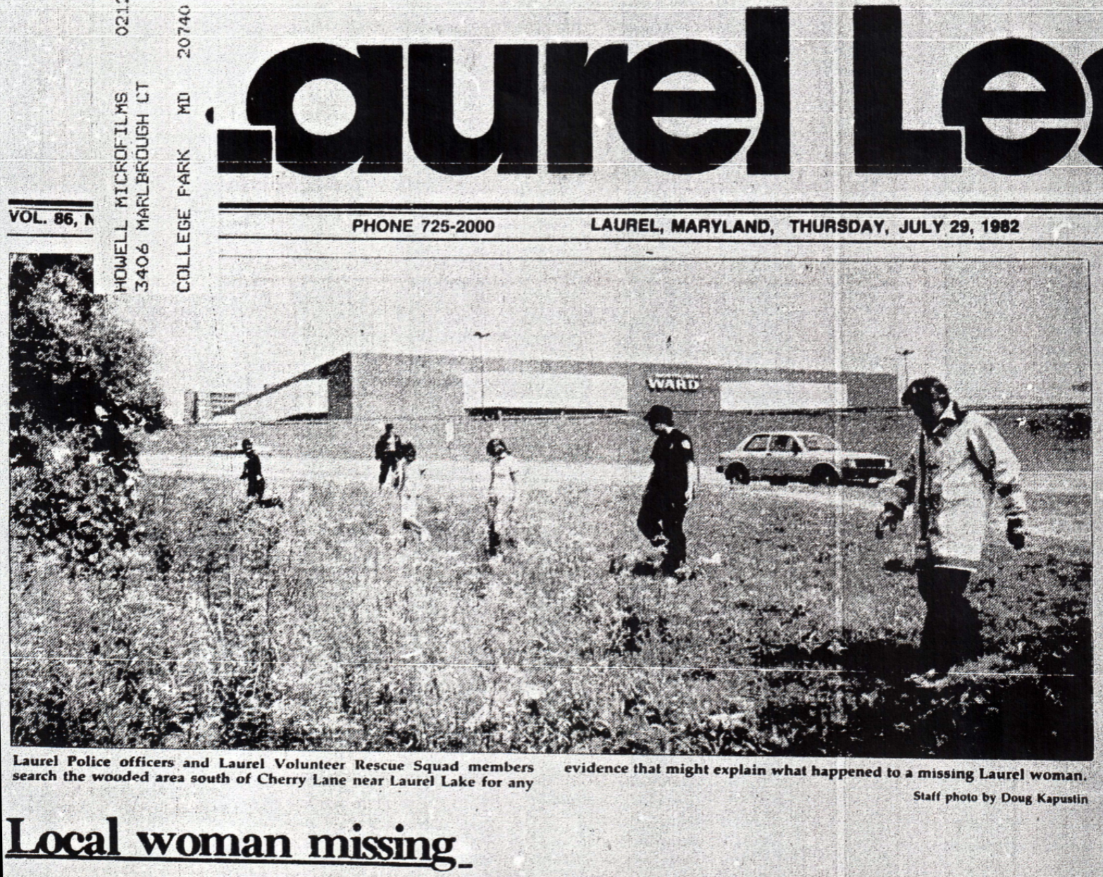 I began by speaking to friends and acquaintances who remembered the events of 1982 at least as well as I do. Online, I was only able to find brief articles in the Washington Post and Baltimore Sun‘s archives, but a treasure trove came via the Laurel Leader on microfilm. There, on the analog monochrome screen at the Laurel Library, was the full weekly saga from July to September 1982. I was about to discover the Stefanie Watson case all over again—reading the details as they emerged that harrowing summer thirty years ago.