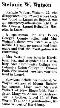 She was born Stefanie Wilbert in Harrisburg, PA in 1955, and was 27 years old at the time of her disappearance. A graduate of Central Dauphin East High School in Harrisburg, Stefanie had also attended Harrisburg Community College. She came to the Washington, DC area to attend Columbia Union College (now Washington Adventist University) in Takoma Park in September 1981, and settled in Laurel after her brief marriage to W. Wayne Watson ended in separation. (Mr. Watson was quickly and definitively ruled out as a suspect).