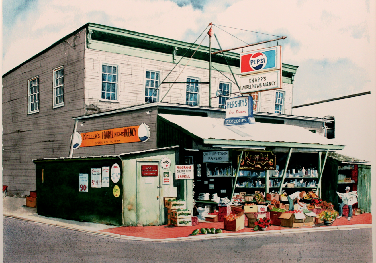 • And the first contribution of $250 or more will receive a framed 23″ x 30″ vintage 1990s illustration of Main Street businesses—which hung hidden for years in the Laurel Art Center.