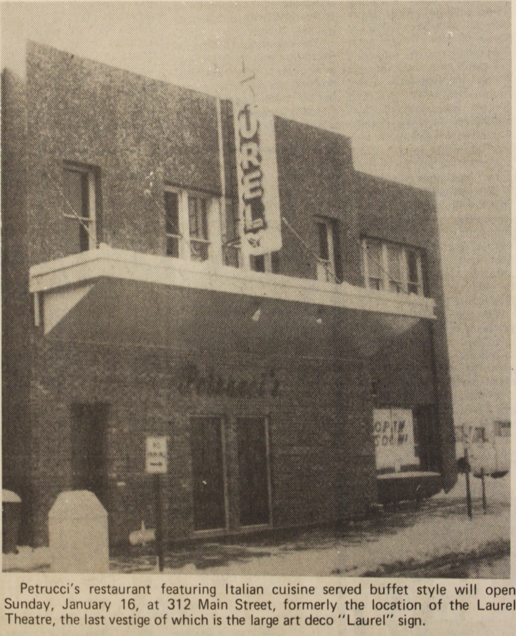 That same year, Carlo Petrucci—who’d already bought the adjacent Pal Jack’s Pizza at 310 Main Street back in 1970—purchased the building. The sale was noted in the April 26, 1976 issue of Box Office magazine: