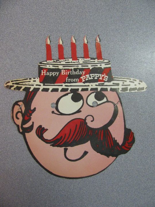 What most people tend to recall at the first mention of Pappy’s are those styrofoam hats—which were worn by staff members and available for kids. After years of searching for one, I’ve finally tracked down a pair of the original hats! One of them will soon be at the Laurel Museum, as part of the ever-expanding Lost & Found Laurel exhibit. Hmm… They’re a bit smaller than I remember.