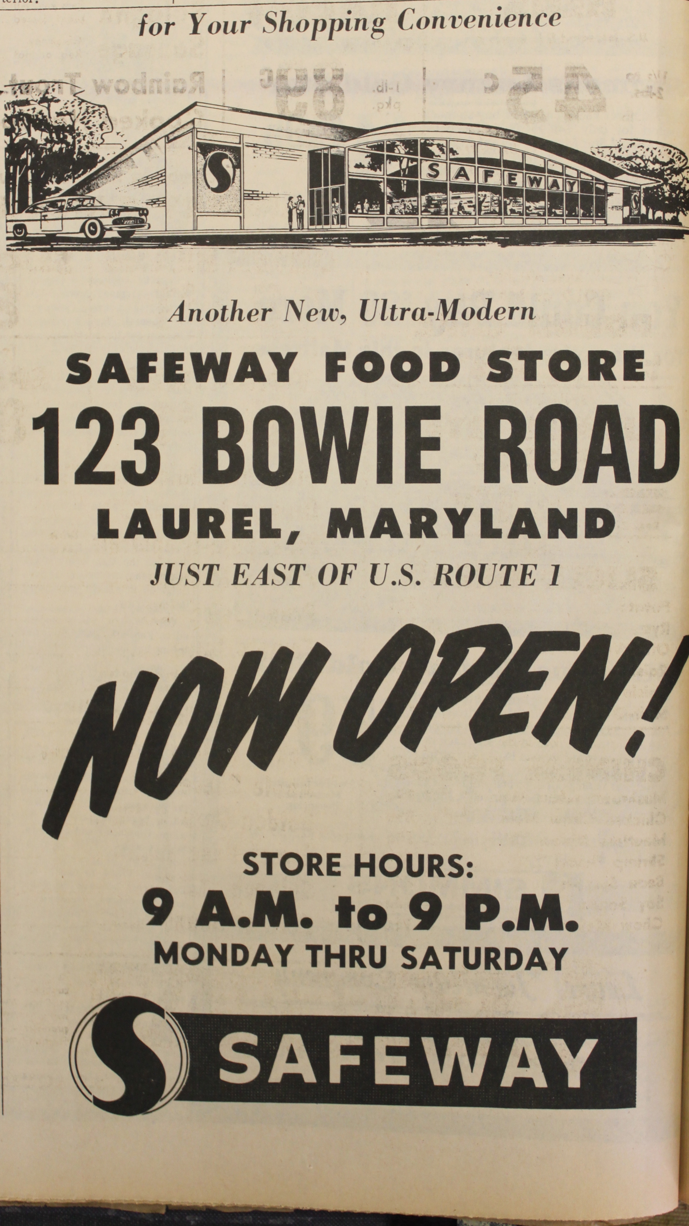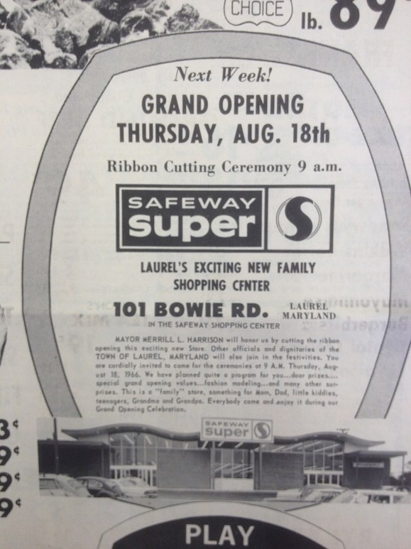 So, a question I’d often wondered about was finally answered. The Safeway on Bowie Road first opened its doors in January 1966. The adjacent shopping center, which included Market Tire, Arundel Furniture, and Chicken Roost, among others—also another story for another time—opened in April.