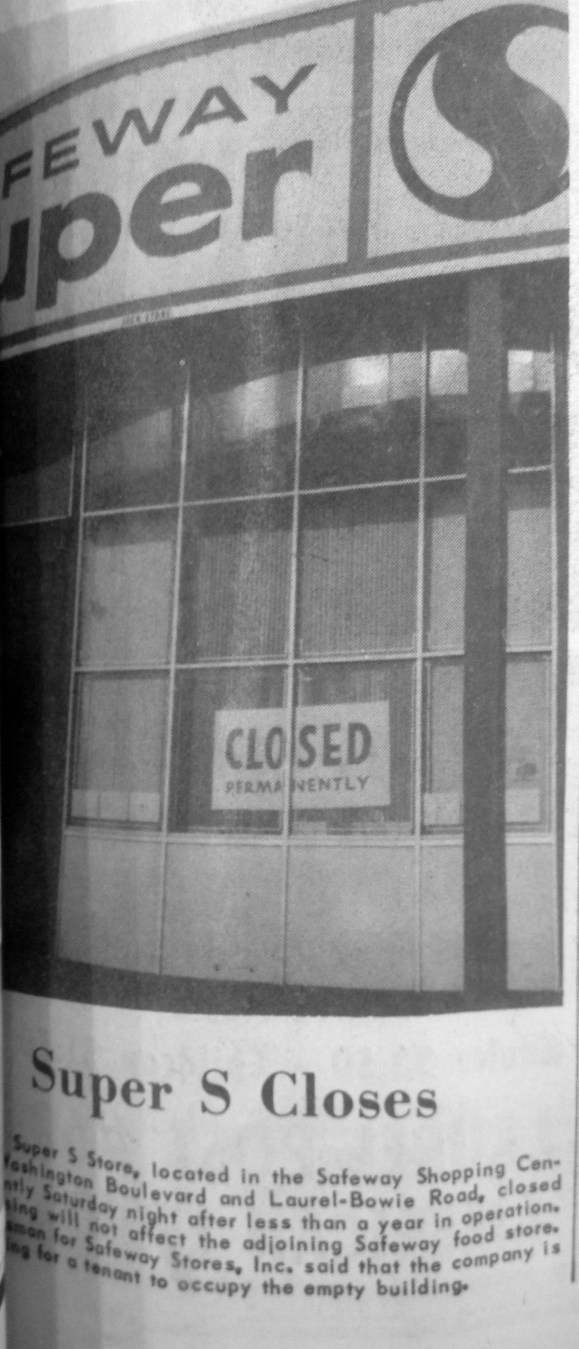 Last, but not least, I’d heard many a story about Laurel’s original Safeway—a location just off Main Street that, like its successor, was eventually deemed too small. That store was located on C Street, in the little building that would actually become City Hall and the Laurel Police Headquarters in 1972. Apparently, it continued to briefly do business even after the larger, new store opened on Bowie Road. In fact, according to this amusing snippet from September 1969, customers were still showing up even after it had closed.