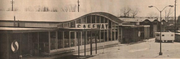 Admittedly, I suspected that I might actually find a photo of the store; in an earlier newspaper, I had come across this bold announcement, which included a stock illustration of a similar Safeway store (but without the aforementioned awesome roller track/conveyor belt thing).