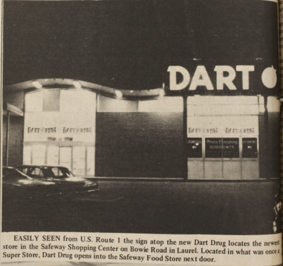 It also immediately struck me as rather ironic that Safeway had actually occupied this entire, massive structure—yet would ultimately move to Laurel Lakes nearly 20 years later in need of more space. What happened there? What exactly was Super S, and how (and when) did it eventually become the Dart Drug that we all knew and loved?